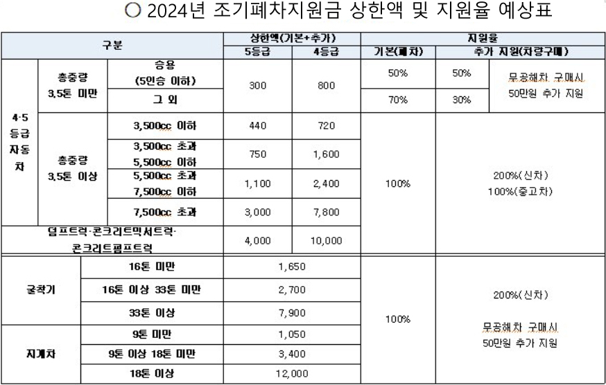 1. 가장 많이 해당되는 총 중량 3.5톤 미만의 5등급 경유 차량은 최대 300만원까지 지원되고, 4등급 경유 차량은 최대 800만원까지 지원됩니다.